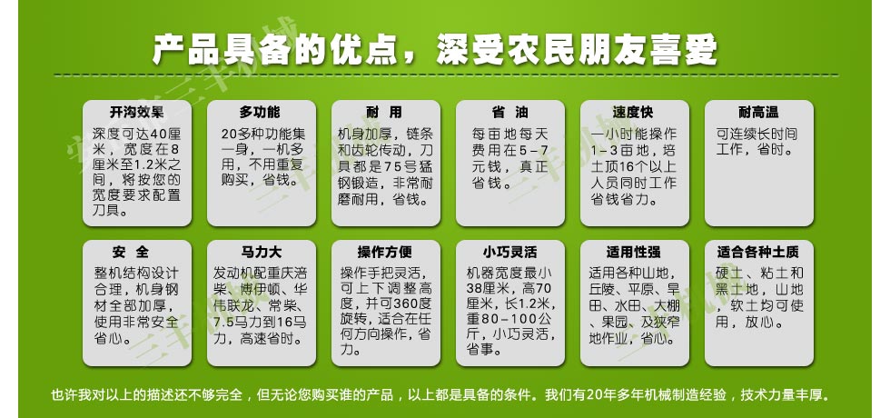 公司生產的微耕機品質好、質量用,機身一次沖壓成型;擁有一臺機器即等于免費擁有了10名工人